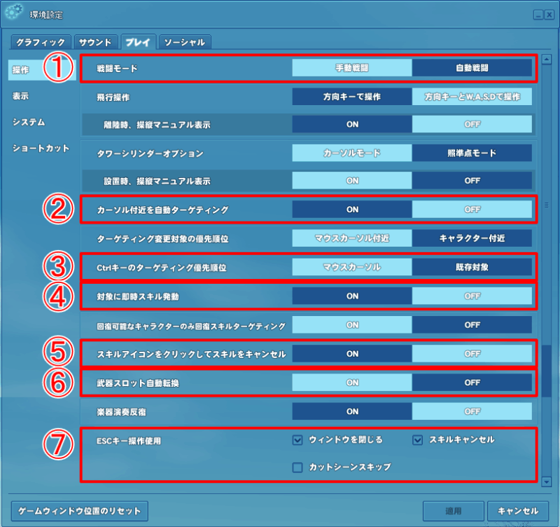 この項目のチェックを入れておくと、戦闘中の忙しい作業中にアイコンを誤クリックによるスキルのキャンセルを防ぐことができますので、OFFをおすすめします。