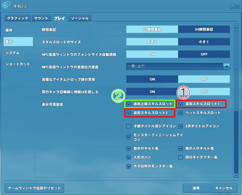 項目は非常に多いですが、基本的には何かを表示するかどうかなので、お好みとなりますので、追加スキルスロットについての説明のみとします。