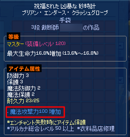 これ以前の装備では専門家用シルクの紡織手袋魔法攻撃力増加の細工を付けたものを使っている人もいるかと思います。